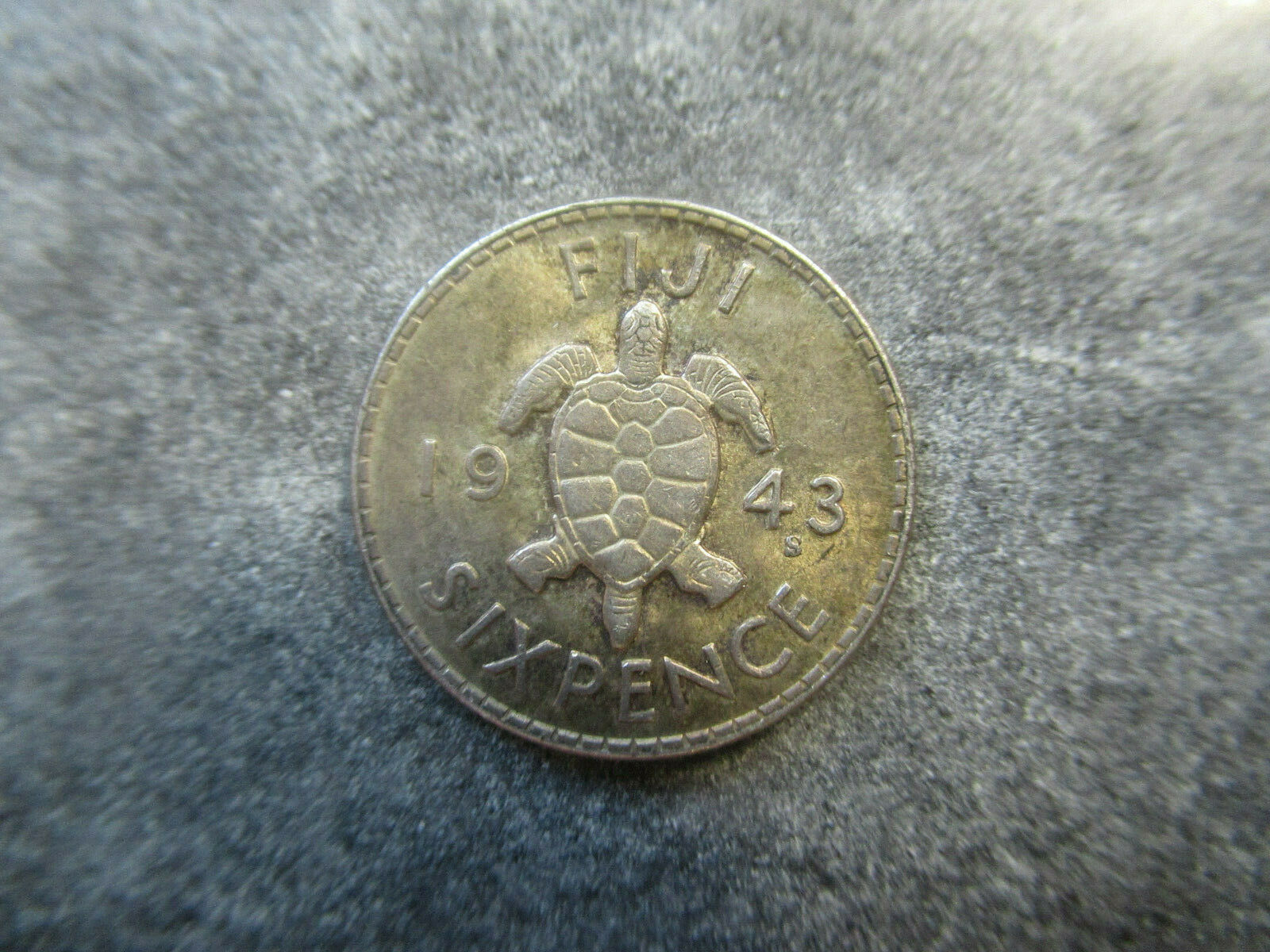 Fiji 1943 S KGVI - Turtle Sixpence 6d Silver coin Better Grade - tone